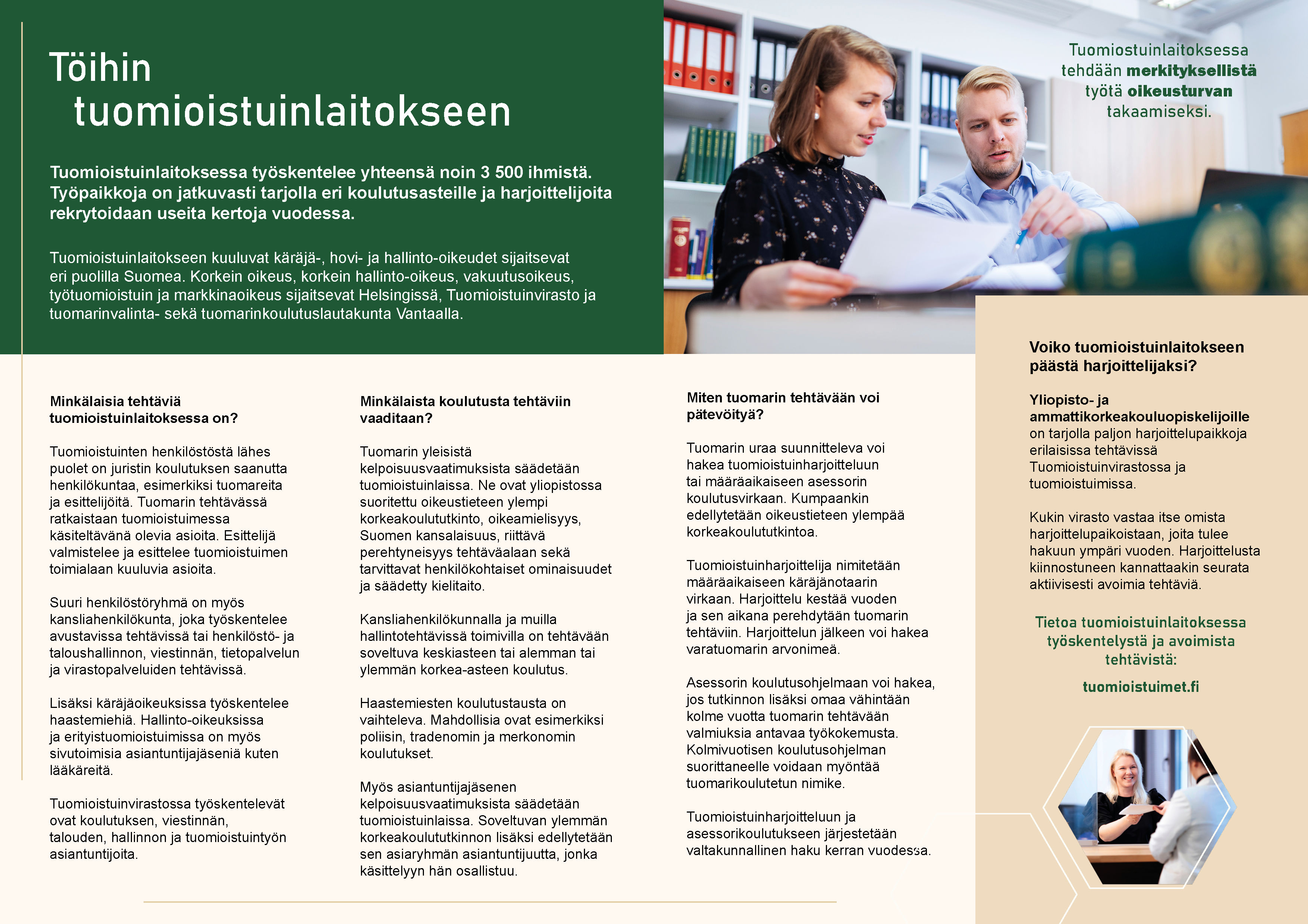 Tuomioistuinlaitoksessa, johon kuuluvat tuomioistuinten lisäksi Tuomioistuinvirasto sekä tuomarinvalinta- ja tuomarinkoulutuslautakunnat, työskentelee yhteensä noin 3500 ihmistä.