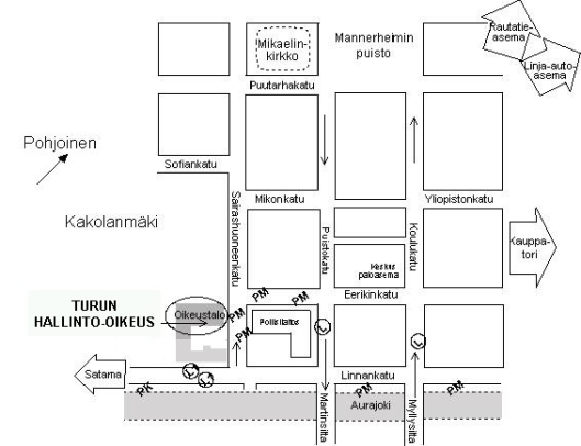 Ulkopaikkakuntalaiselle helpoin tapa löytää perille on seurata Aurajokea ja kääntyä Linnankadulta Sairashuoneenkadulle, jossa Turun oikeustalo sijaitsee.