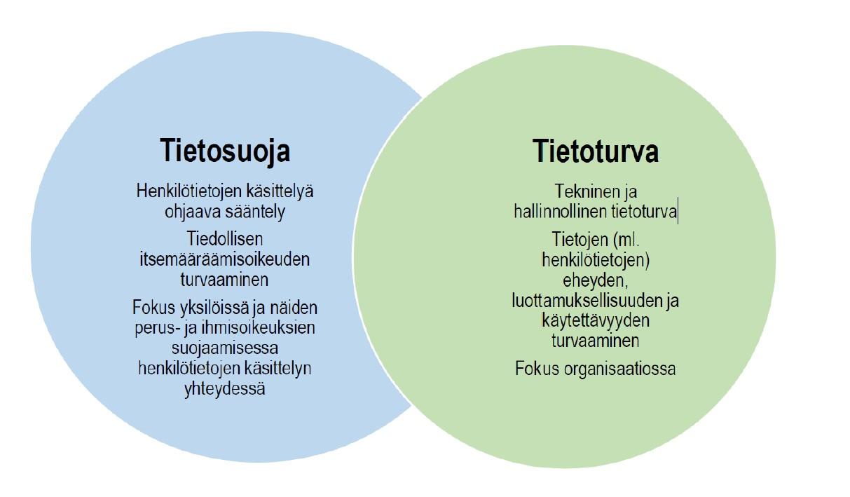 Tietoturva ja tietosuoja ovat toisiaan täydentäviä ja niitä voi olla vaikea erottaa toisistaan. Tiivistetysti tietoturva on keino toteuttaa tietosuojaa eli sen tavoitteena on suojata käsiteltyjä tietoja. Tietosuojalainsäädäntö edellyttää, että tekniset ja organisatoriset tietoturvatoimenpiteet mitoitetaan riskilähtöisesti sen mukaan, millaisia riksejä henkilötietojen käsittelystä voi yksilölle potentiaalisesti aiheutua.