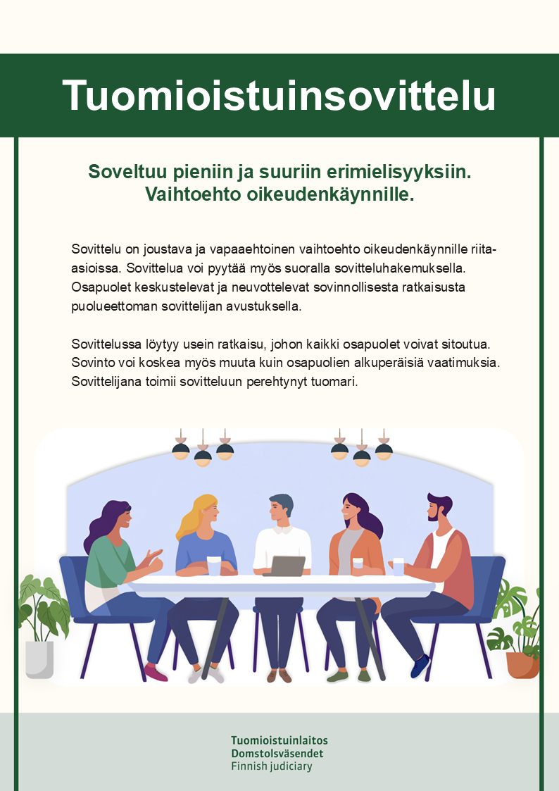 Tuomioistuinsovittelu-esitteestä löydät tiivistetysti tiedon siitä, mitä sovittelu tarkoittaa ja miten se eroaa oikeudenkäynnistä. Esite saatavilla seitsemällä eri kielellä: suomeksi, ruotsiksi, englanniksi, ranskaksi, venäjäksi, somaliksi ja arabiaksi.
